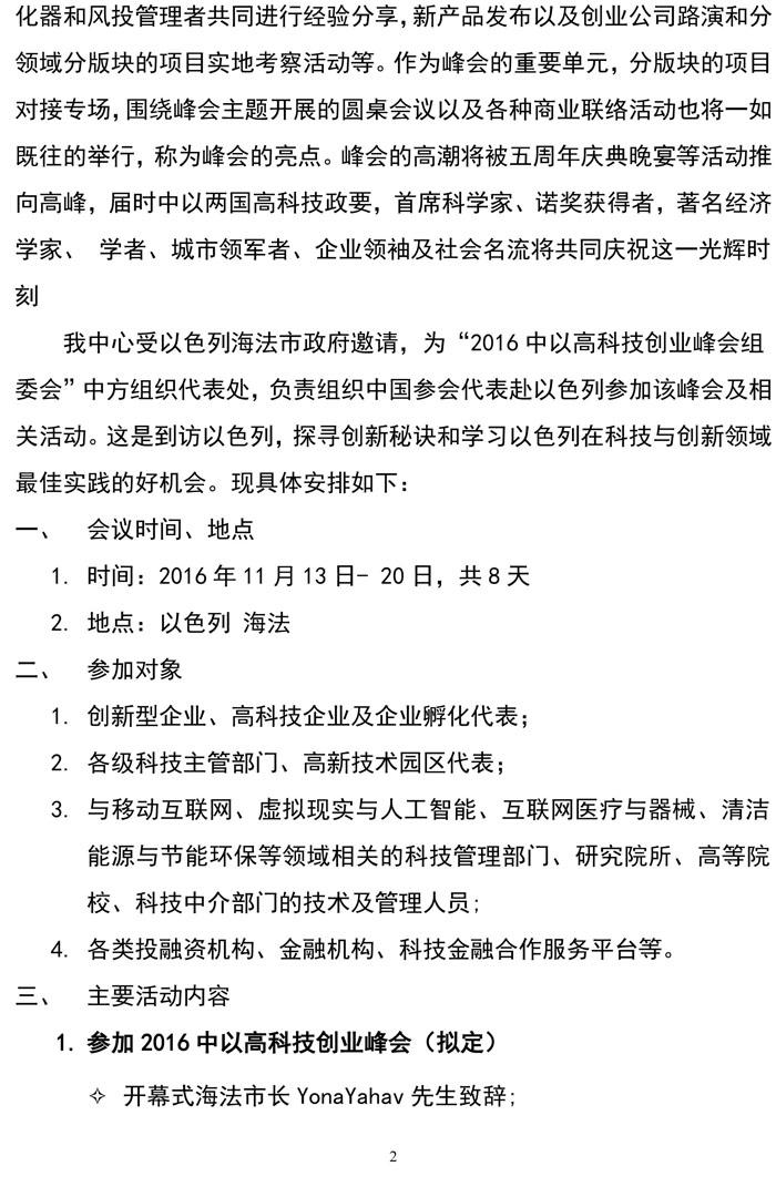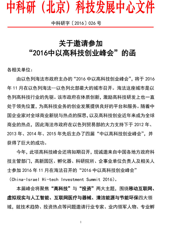 关于邀请参加 “2016中以高科技创业峰会”的函